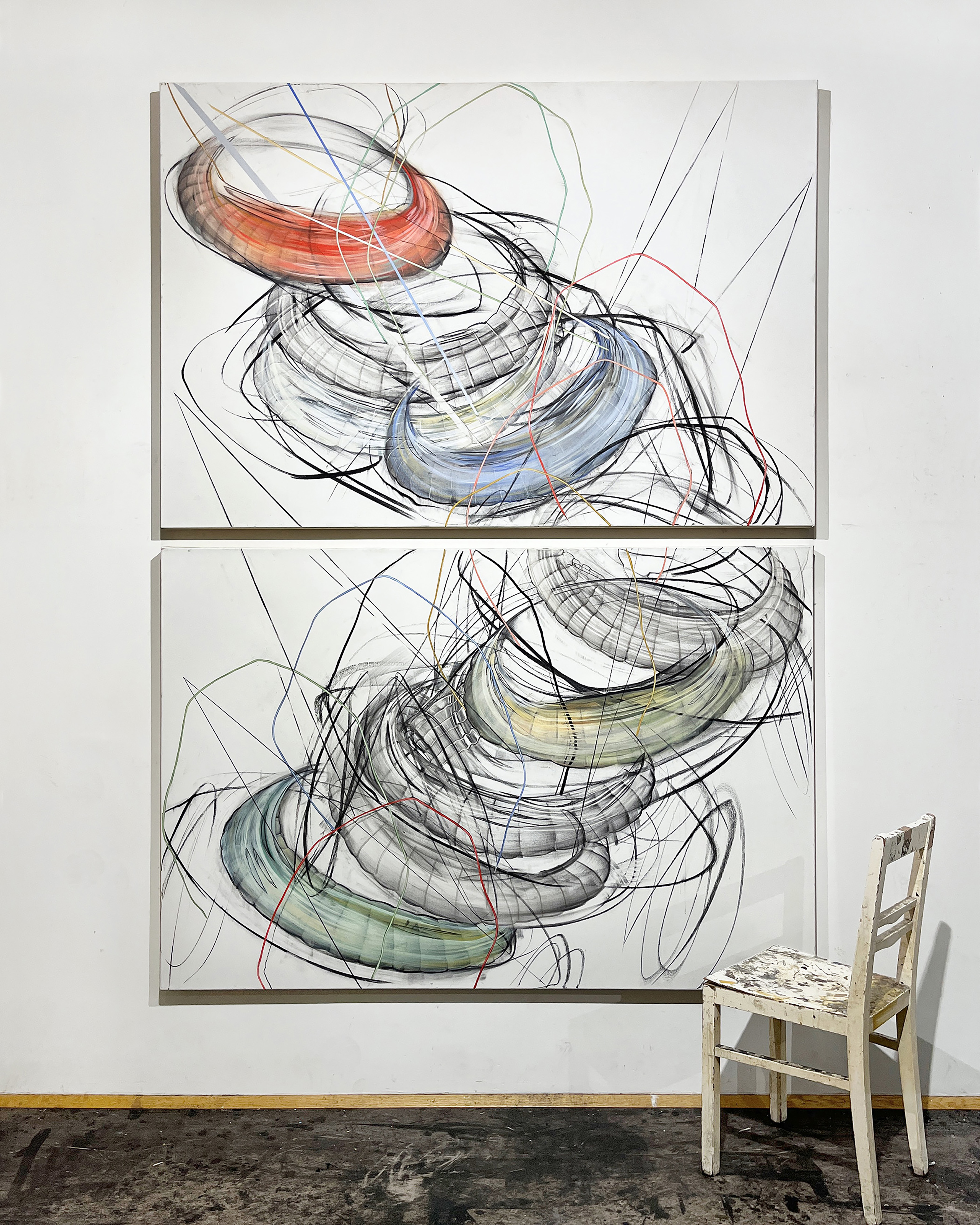 2) Two People Ascending a Staircase While Looking at Each Other 1 & 2 (studio view), charcoal and acrylic on canvas, 2025 - 240 x 180 cm, Foto: Stylianos Schicho